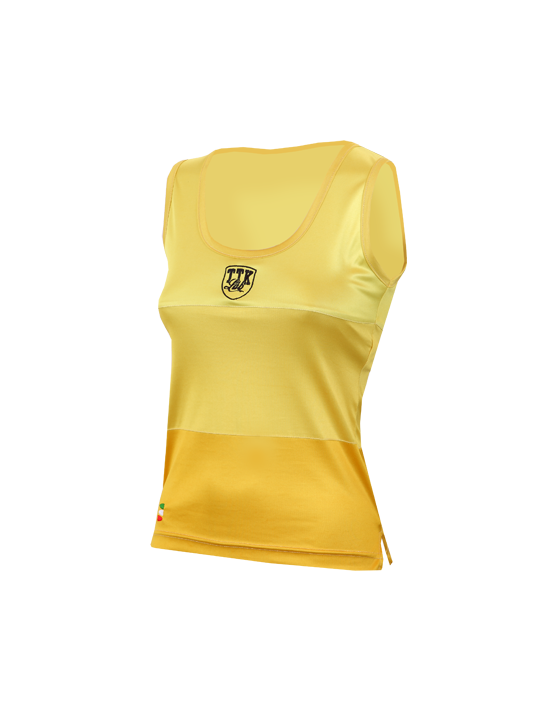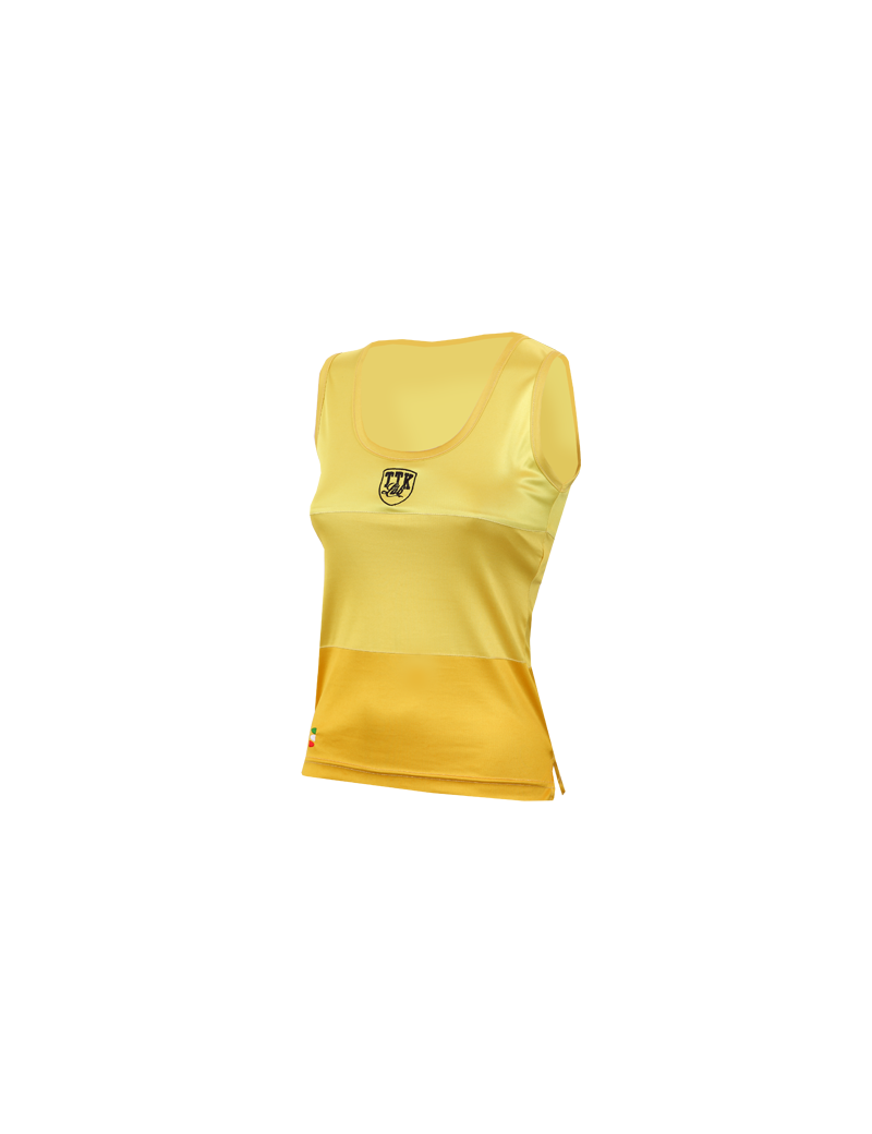 Top junior da tennis della collezione TTK-LAB in tessuto tecnico traspirante multicolor, spalline a canotta ad inserti di varie tonalità di giallo.