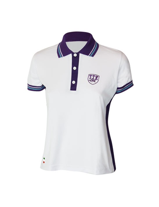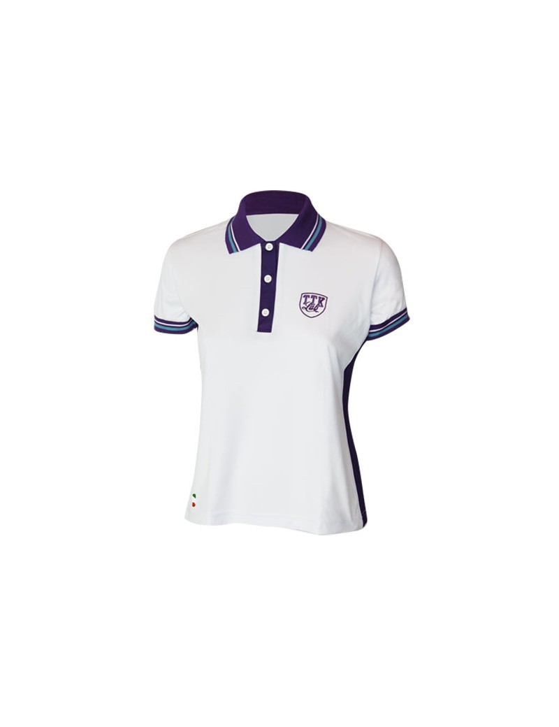 Polo junior da tennis della collezione TTK-LAB in tessuto tecnico traspirante bianco, collo ed inseri lateri in Texa in viola.